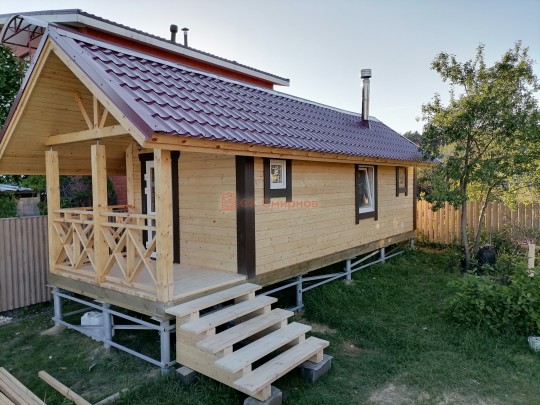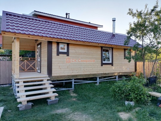 Очень удачный проект классической одноэтажной бани с двускатной крышей и террасой перед входом. На фотографиях и видео банька, которую мы построили в начале лета 2021. Это пример того, что может получиться из весьма простого проекта.