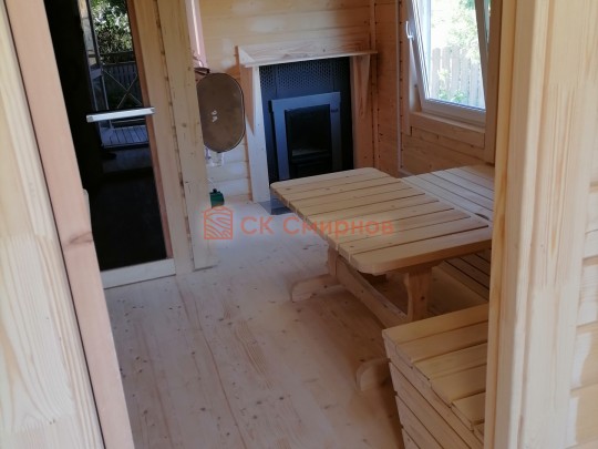 Строение одноэтажное, но с чердаком (он не жилой, но может использоваться для хранения) — подняться можно с террасы по приставной лестнице. Баня размером 3 на 8 метров. Внутри 3 помещения: комната отдыха, парная и душ. Установлена независимая душевая система с бойлером и насосом. Проектом предусмотрена печь с выносной топкой через стену. Каменка остаётся в парной, а топить нужно из комнаты отдыха. Это удобно.