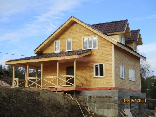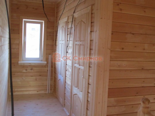 Из профилированного клееного бруса 9х14см, 14х14 см или 14х19 см. Сборка сруба в теплый угол на нагеля или гвозди 200 мм со сверлением отверстия в верхнем брусе (в зависимости от вида бруса).