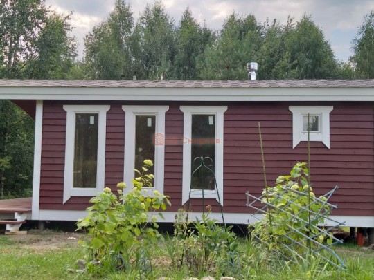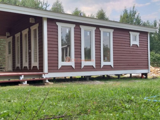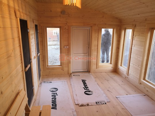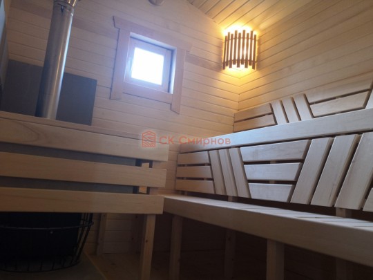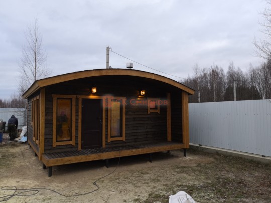 Бани подобного типа мы строим как по каркасной технологии с утеплением и обшивкой доской внахлёст, так и из клееного или сухого бруса. В обоих случаях качество сборки превосходное: баня тёплая, надёжная и очень красивая.
